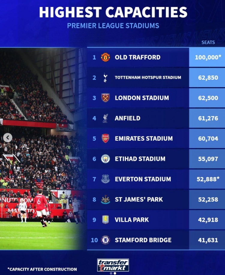 3月11日訊 曼聯已經官宣將建造能夠容納10萬人的新主場,《轉會市場》也列出了數年后的英超各隊主場容量榜。