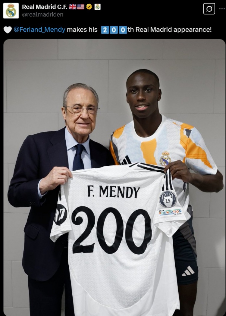 本場比賽也是門迪代表皇馬各項(xiàng)賽事第200次出場,球隊(duì)官方也曬出門迪與主席弗洛倫蒂諾的合照,祝賀他達(dá)成這一里程碑。