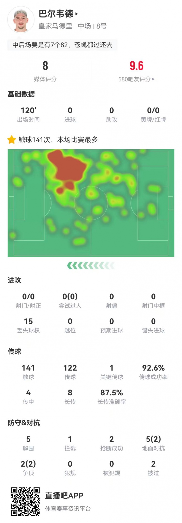 巴爾韋德本場5解圍2搶斷2被過 8長傳7成功+1點球大戰進球 獲8.0分?