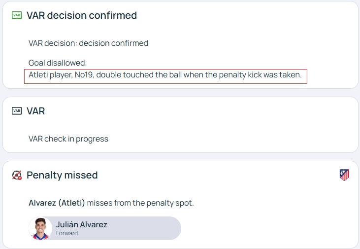 官方明確!歐冠官網:阿爾瓦雷斯罰點時2次觸球,VAR決定進球無效?