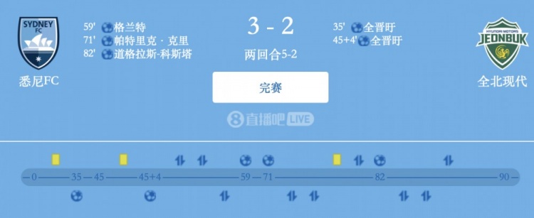 比賽最后階段,道格拉斯-科斯塔點球破門,最終悉尼FC主場3-2擊敗全北現代,總比分5-2晉級四強。