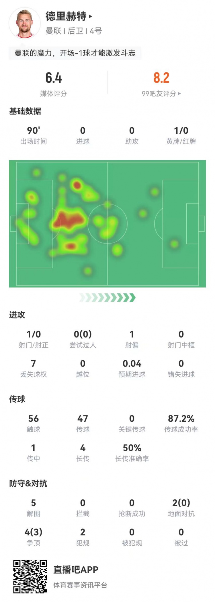德里赫特本場5解圍1封堵1送點 6對抗3成功 獲評6.4分全隊最低?
